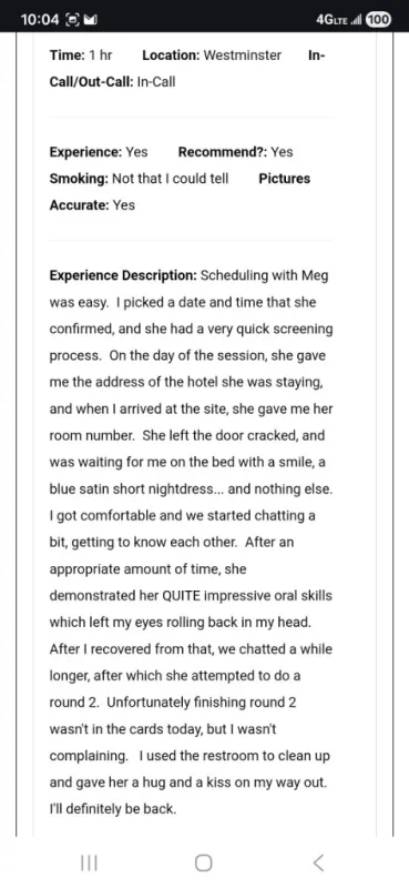 https://theotherboard.com/users/121190 ****OUTcalls REQUIRE deposit*** < @your place > 30 min... 300 hour... 400 2hr... 700 3hr... 900 < @my place > 15 min... 170 lip service only 30 min... 250 Hour ...350 2Hour ... 650 3Hour ... 900 Newbie friendly! I travel for a fee!! I’m Meg, a tall, captivating brunette with stunning blue eyes and a personality that draws you in from the very first glance. My Southern charm and sophisticated presence create the perfect blend of elegance and excitement. Whether you're seeking a stimulating conversation, a luxurious escape, or a little playful adventure, I’m here to deliver. My secret shenanigans are guaranteed to leave you craving more, and I promise an unforgettable experience every time we meet. Let’s take things to the next level—fly me out and let’s explore new pleasures, far from the ordinary. Discretion and an indulgent time await. @MeetMegTheQueen on X
